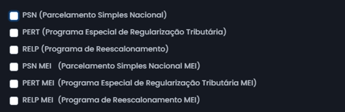 PSN (Parcelamento Simples Nacional): Parcelamento padrão para empresas optantes pelo Simples Nacional.