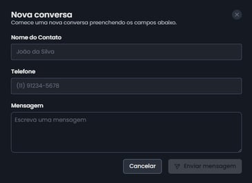 Com esta funcionalidade, é possível iniciar uma nova conversa manualmente, inserindo um número de telefone e enviando uma mensagem inicial diretamente pelo ConnectHub.