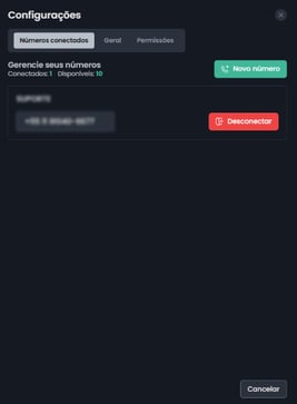 Números Cadastrados: possibilita a inclusão ou exclusão de números de telefone vinculados à integração.