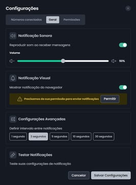 Geral: permite configurar o comportamento das notificações (volume sonoro, silenciamento, exibição em pop-up), definir o intervalo entre os alertas e até testar o som das notificações.