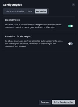 Permissões: define se o usuário atual pode utilizar o recurso de integração do WhatsApp e se as mensagens enviadas terão uma assinatura identificando o nome do colaborador no topo das mensagens exibidas ao cliente.