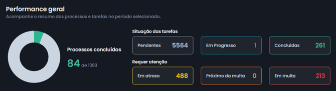 Status dos processos (pendentes, em progresso, concluídos e em multa);