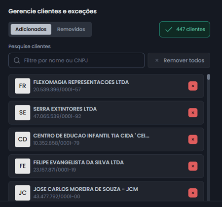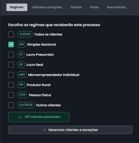 Dentro dos regimes selecionados, é possível determinar se um cliente específico fará parte do processo ou se será tratado como exceção.