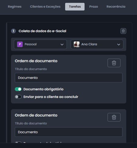 É possível definir o departamento responsável, o colaborador responsável, anexar documentos e até marcar a obrigatoriedade desses documentos para a conclusão da tarefa ou para envio ao cliente.