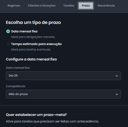Data mensal fixa – determinar um dia específico de vencimento, escolher a competência, estabelecer um prazo meta e indicar se o processo gera multa em caso de atraso.