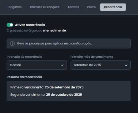 Importante: a recorrência só pode ser configurada em processos com data mensal fixa.