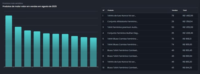 Visualize indicadores e resultados relacionados às notas de produtos, trazemos as principais informações sobre os produtos de maior valor e até mesmo os produtos mais vendidos em determinado período.